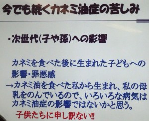 ●カネミ油症の特効薬はいまだ開発されておらず長く苦しんでいるので、多くの支援と理解が必要である。
