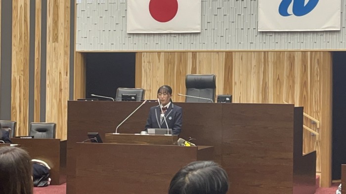 令和7年12月18日(木)に長崎県庁議会棟議場で行われた、県内高校生と県議会議員との交流事業に本校2年生の久保川愛子さんが参加をしました。
