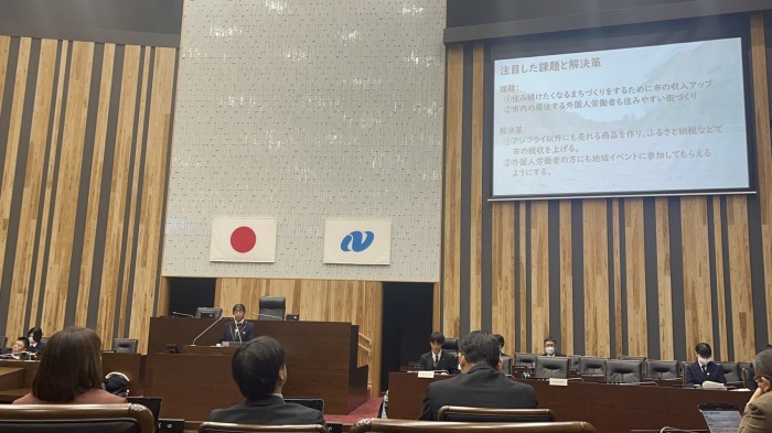久保川さんは、もっと住みやすい松浦市にするために、外国人労働者の方との交流の促進について提言を行いました。地域のイベントや食を通じて地域の方と外国人労働者が交流できるきっかけ作りを実践したことを踏まえながら発表を行いました。