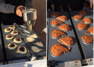 「まつドリー焼き」は、松高マスコットキャラクター「まつドリー」をモチーフに、焼き型を製作し、たい焼きミックス等で生地を作り、あんこ・チョコ・クリームなどを挟み込み、焼き上げます。