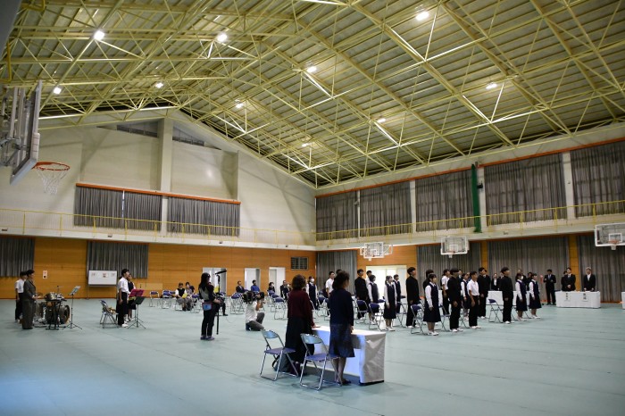 そのあと、本校の愛唱歌である「瞳を閉じて」、校歌斉唱を行い。