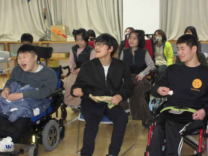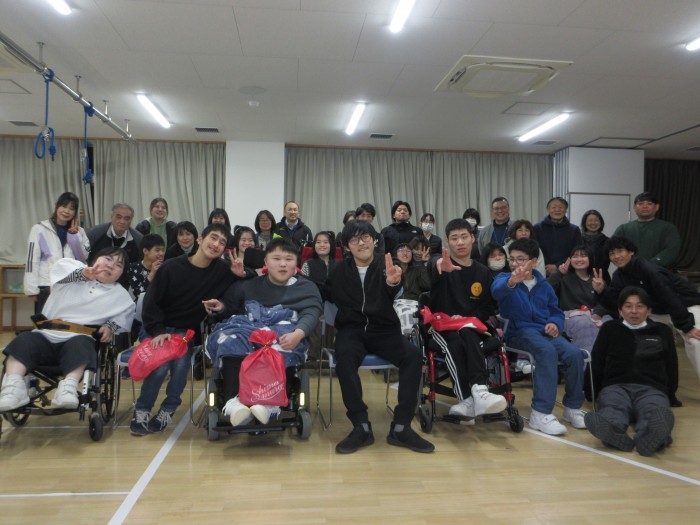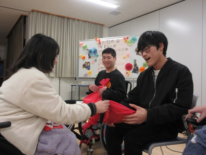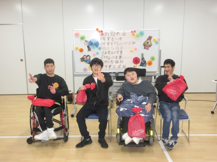 お別れ会。高等部卒業生(5名)をお祝いしました。卒業生の寄宿舎生活のフォトムービーを見ました。