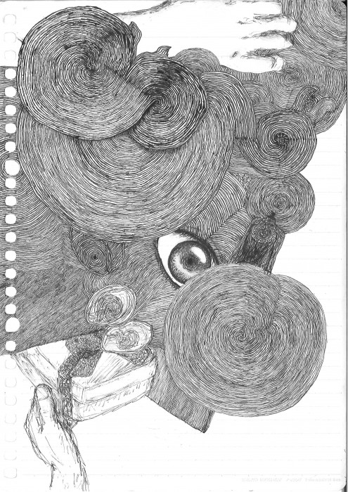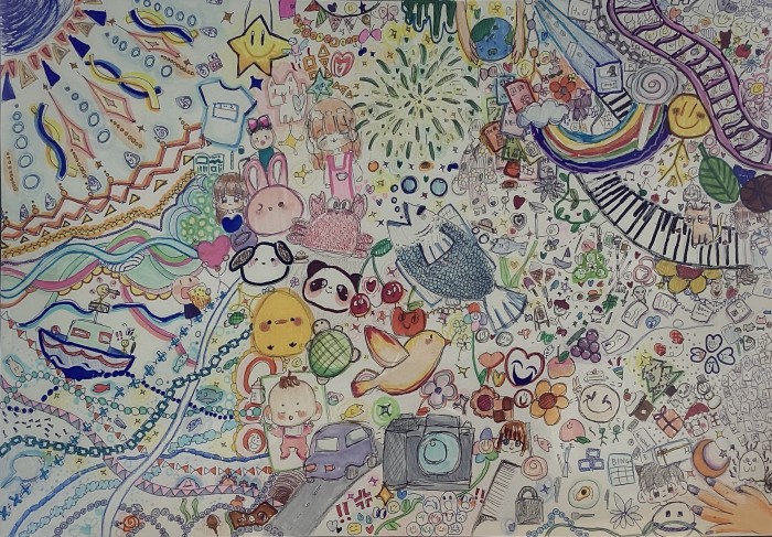 ボールペンやマーカーを使って細かく描かれた中学生の元気で明るい感性が詰まった