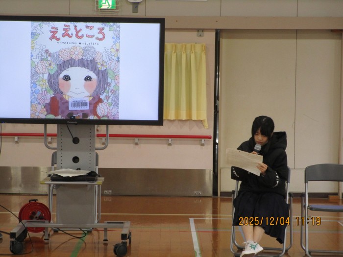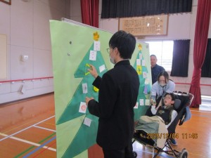 12月4日(木)4時間目に人権集会がありました。集会では、くすのきしげのり作・ふるしょうようこ絵の絵本『ええところ』の読み聞かせを行いました。この絵本を通して、友達の良いところを見付ける大切さを学んだ後、事前に書いて持ち寄ったメッセージカードを活用した活動をしました。一人一人の「いいところ」が書かれたメッセージカードを、みんなで協力してクリスマスツリーに飾りつけました。参加した児童生徒は、お互いの良さを認め合う喜びを感じ、誰もが大切な存在であるという思いやりの心を深めることができました。