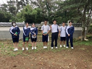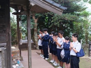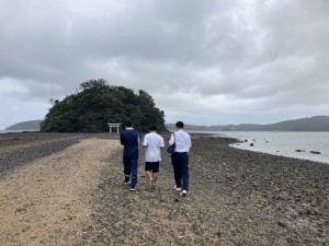 令和7年10月8日(水)東アジア歴史・中国語コースの1年生が、歴史学入門で島内巡検を行いました。今回は、芦辺町にある「旧日本海軍見張所・兵舎跡地」・「少弐資時(しょうにすけとき)の墓、碇石、狼煙台」・「壱岐神社」・「龍蛇(りゅうだ)神社」・「小島神社」を見学しました。旧日本海軍見張所・兵舎跡地では、監視所からの眺めから当時の様子を想像し、兵舎跡地では、浴槽があった場所や水を溜めていたコンクリートの一部などを見学しました。小弐公園(しょうにこうえん)にて、少弐資時の墓や碇石、壱岐神社を見学し、弘安の役に関する理解を深めました。また龍蛇神社では、由来や出雲大社との関係などを学ぶことができました。最後に以前訪れた際には渡れなかった小島神社を訪れて巡検を終えました。