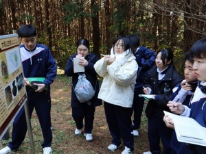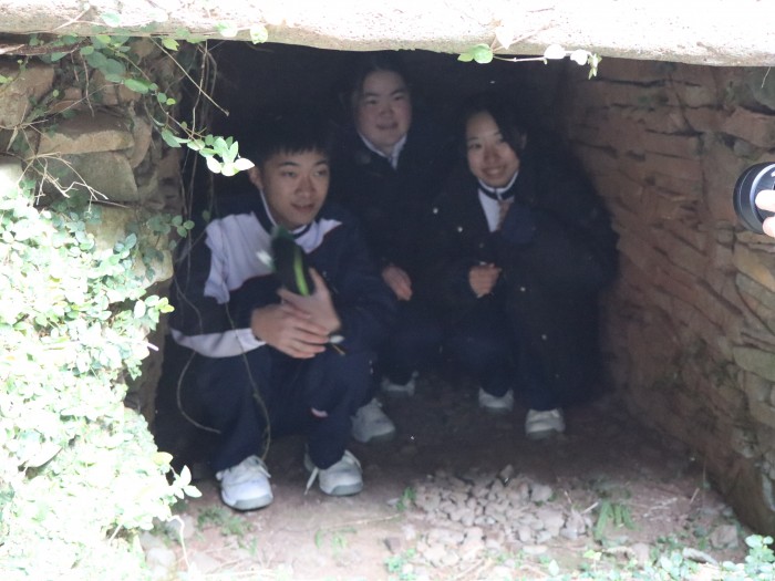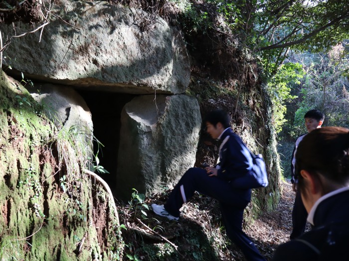 今回は、芦辺町にある大塚山古墳、安国寺、覩城(とじょう)、興原(こうばる)古墳を訪れました。大塚山古墳では、石室の構造などの説明を受け、実際に石室に入って内部を観察しました。安国寺は足利尊氏と弟の直義の命で建立されたお寺で、境内にある樹齢600年を超える「大スギ」の大きさに生徒たちも驚いていました。覩城(とじょう)では遺物などを探しました。最後に3年生が発表した研究論文「興原(こうばる)古墳の石材運搬に関する研究」の内容から、石材を運んだと思われるルートを実際に興原(こうばる)古墳まで歩いてみました。