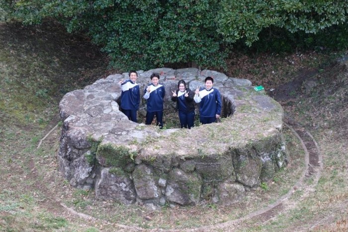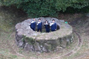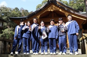 天手長男神社は壱岐の一の宮ともいわれる場所で階段の段数を数えながら登る生徒もいました。住吉神社では境内の「夫婦クスノキ」などを見学しました。車出遺跡にて、地表調査をおこない、弥生土器や須恵器を探し、見つけた弥生土器片に実際に触れて感激していました。最後に壱岐島を一望できる岳ノ辻展望台にて、これまで巡検で訪れた場所の位置を確認していました。