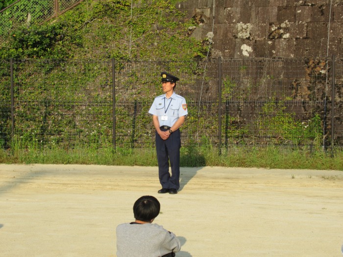 避難場所のグラウンドに集合し、全員の安全を確認した後、来校していただいた中央消防署の山川様と山口様に、今回の訓練の講評と消火器の使用方法についての説明を受けました。