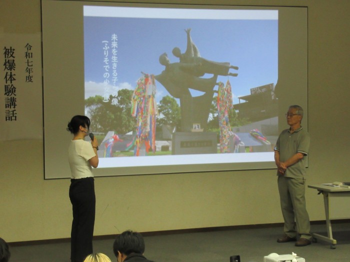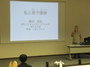続いて、公益財団法人長崎平和推進協会に所属されている被爆者の堀田武弘様を講師にお招きし、『私と原子爆弾』というテーマで被爆体験講話をしていただきました。