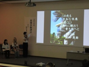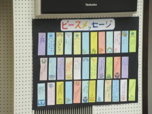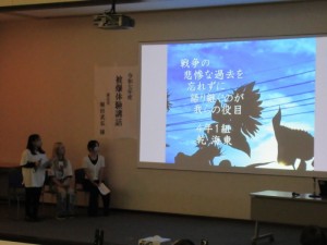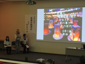 その後、生徒会役員の松本さん、樋口さん、山崎さんが生徒一人ひとりが作成したピースメッセージと本校独自の平和宣言文を朗読して、会は終了となりました。
