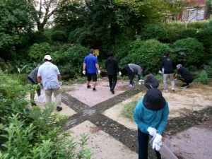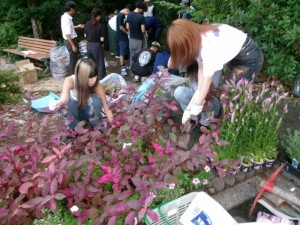 生徒たちは、石原さんの事務所の方々に指導を受けながら、本校の中庭にある池周辺の除草作業と花の苗植えをするグループと、グラウンド周辺の除草作業を行うグループに分かれて、それぞれ清掃活動に取り組みました。