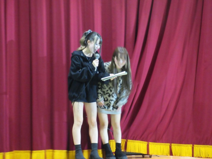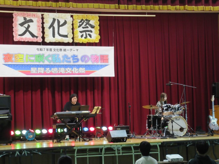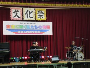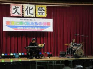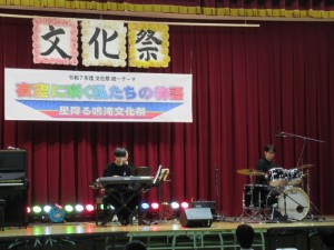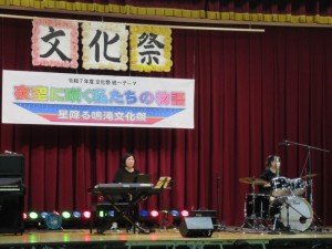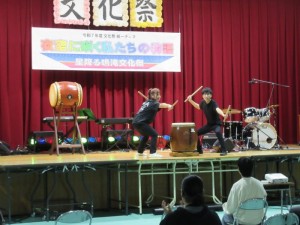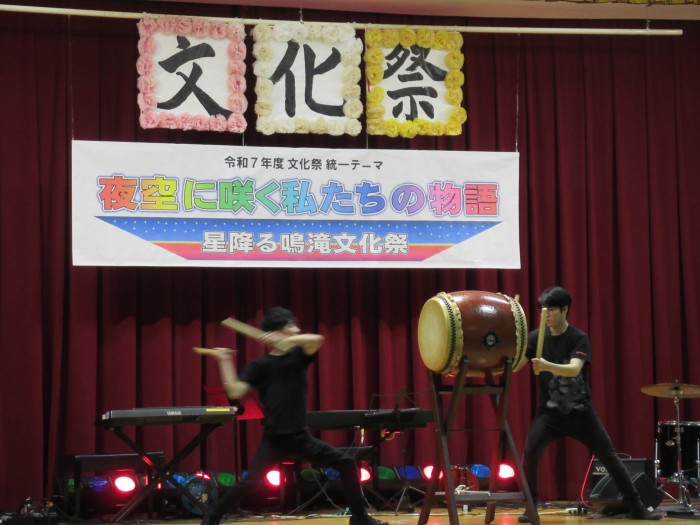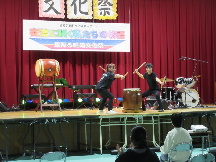 ステージ発表のプログラム1番は、和太鼓部の演奏です。部員は2名と少ないですが、4月から練習を続けてきた、『豊年太鼓』と『八丈島太鼓』の2曲を堂々と披露したところ、会場からは大きな拍手が送られていました。