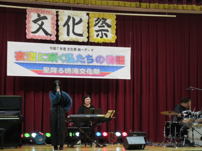 プログラム3番は、音楽選択者による演奏です。音楽担当の小嶺先生と卒業生の森くんのサポートを得ながら、8名の生徒が13曲の演奏を披露しました。最新のヒット曲からお父さん・お母さん世代が懐かしいと感じる歌謡曲までと幅広いレパートリーで、会場は大いに盛り上がっていました。