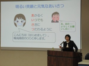 特に、『TPOに応じた3つのお辞儀の使い分け』は初めて知った生徒も多く、元気よく実践練習に取り組んでいましたし、「明るく、いつでも、さきに、つたわるようなあいさつを心がけましょう」や、「社会を支える様々な『役割』を分け合っているのが『仕事』です」、「あなたが思っているより可能性は広がっていますよ」というお話しは、多くの生徒の心に残ったようです。