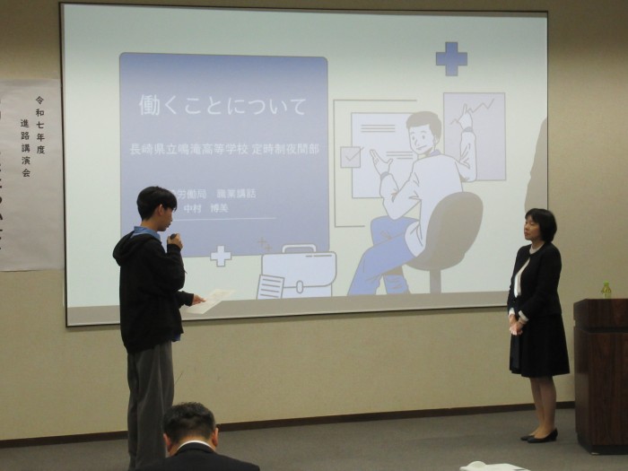 今年度は、長崎公共職業安定所(ハローワーク長崎)で就職支援ナビゲーターをお務めの中村博美様を講師にお招きし、講演をしていただきました。