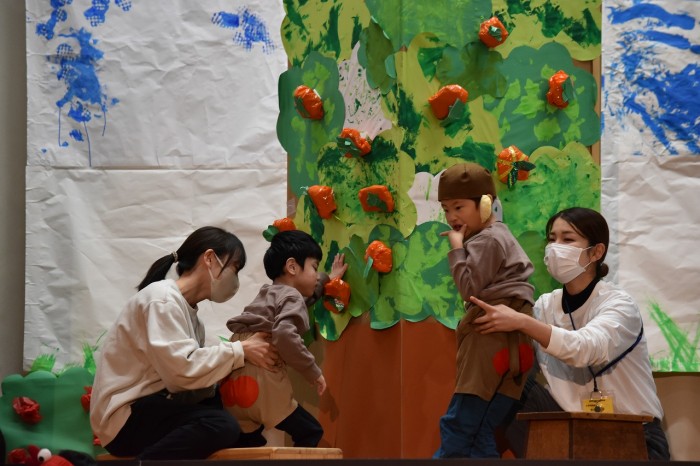 立ち上がって柿の実を取るサル、カニ歩きダンスで柿の木を育てるカニ、ボールを転がし、猿をやっつけるクリ、スイッチやウォーカーを使ってサルに体当たりするウス、サルの腕を引っ張り、柿を取り返す子ガニが大活躍した劇「さるかにばなし」。最後は、「まじっくまんぼ♪」の曲で合奏をしてみんな仲良くなりましたとさ。