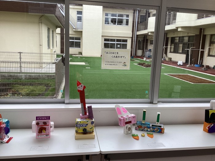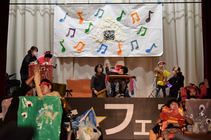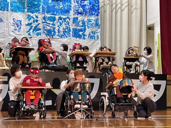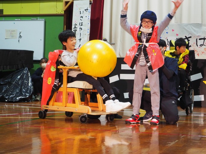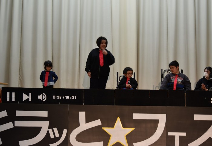 今でも大人気の「ザ・ドリフターズ」のいろいろなコーナーの曲を使って、一人一人の頑張っていることを発表しました。音を聴きながら歩いたり止まったり、顔を客席に向けたりするコーナー、ひげダンスの曲や早口言葉の曲をBGMに、箱を積んだりボールを蹴ったり投げたり渡したりしました。また、頭にお皿を乗せて歩いたり大きな箱を引っ張ったりすることや、言葉を機器に入力したり平仮名を読んだりすることを披露しました。最後は、「ババンババンバンバン♪」とみんなで歌って「だい・せい・こう」! みんな笑顔で締めくくることができました。