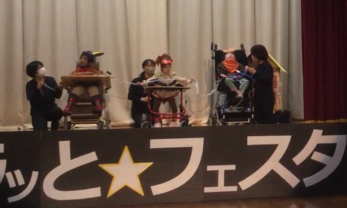 みさかえ地区の3名は、こぶたになってわらの家、木の家、レンガの家を作りました。諫早地区の3名は、それぞれのやり方で家を倒すオオカミになりました。みさかえ地区の子どもたちは動画での出演で、諫早地区の子どもたちは舞台で演技をしました。全員練習をがんばり、協力して一つの劇を披露することができました。