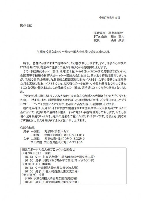この度は、ホッケー部への温かいご声援、誠にありがとうございました。