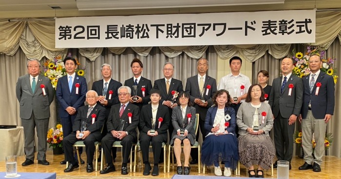 10月5日(土) 第2回長崎松下財団アワード表彰式が行われ、本校の野球部がスポーツ部門で表彰を受けました。長崎松下財団アワードとは、長崎の文化や芸術、スポーツの発展に貢献した個人や団体を表彰するものです。第97回選抜高校野球大会に出場した本校野球部の活躍などが評価され、今回の受賞に繋がりました。今後とも壱岐高校野球部の応援をよろしくお願いします。