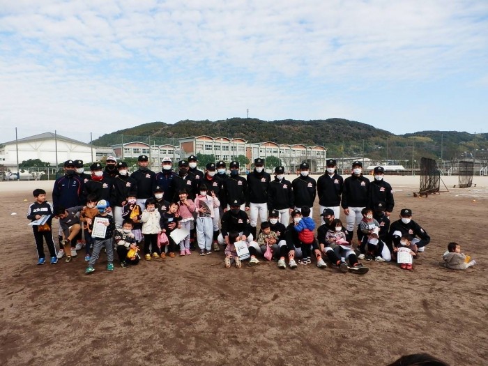 12月10日(日)鹿町工業高校グラウンドでキッズベースボールフェスタを行いました。近隣の園児、小学生が多数集まり、高校生が野球の楽しさを優しく教えていました。ストラックアウトとバッティングを行い、特にバッティングではボールが遠くに飛ぶと嬉しそうしている姿が印象的でした。生徒にとっても、元気な子供達と触れ合うことができ、自然と笑顔がこぼれていました。今後とも、野球や運動の楽しさを伝えていけたらと思います。