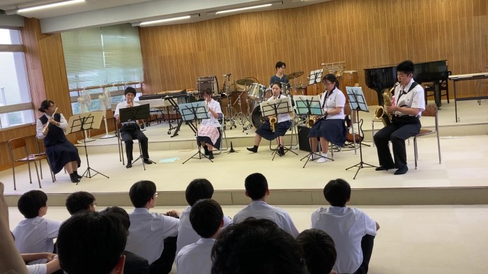 吹奏楽部部長の決意表明、男子総合運動部と女子バドミントン部からのエールのあと、音楽祭で演奏予定の2曲を披露しました。