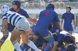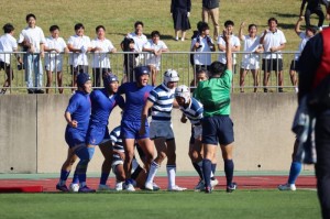 お互いに負けられない息をのむ試合展開は、前半を終えて0-0のまま後半に入ります。緊張する試合展開が続くなか後半15分にフルバック長瀬のキックパスをウイング梁瀬がキャッチしトライ、コンバージョンも決まり7-0とリードします。終了間際にもスタンドオフ村中の執念のトライで追加点を奪い、終わってみれば8年連続24回目の優勝となり、来月27日より東大阪市の近鉄花園ラグビー場で開催される全国大会へ出場することになりました。本校ラグビー部への、多くのみなさまのご声援本当にありがとうございました。
