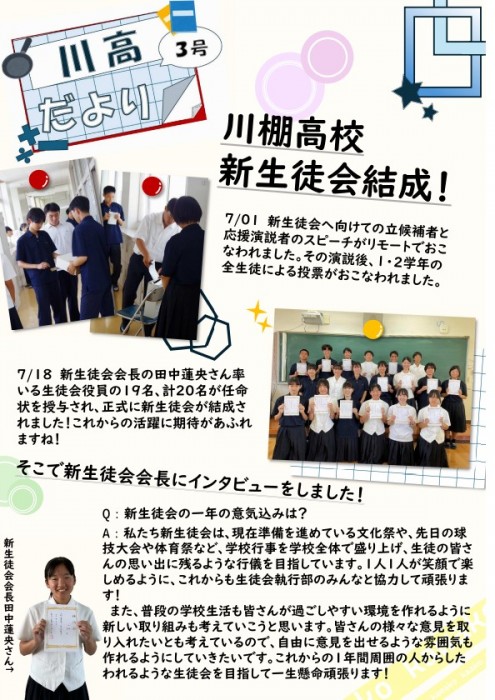 新生徒会の発足や、球技大会などの行事についてご紹介しています。