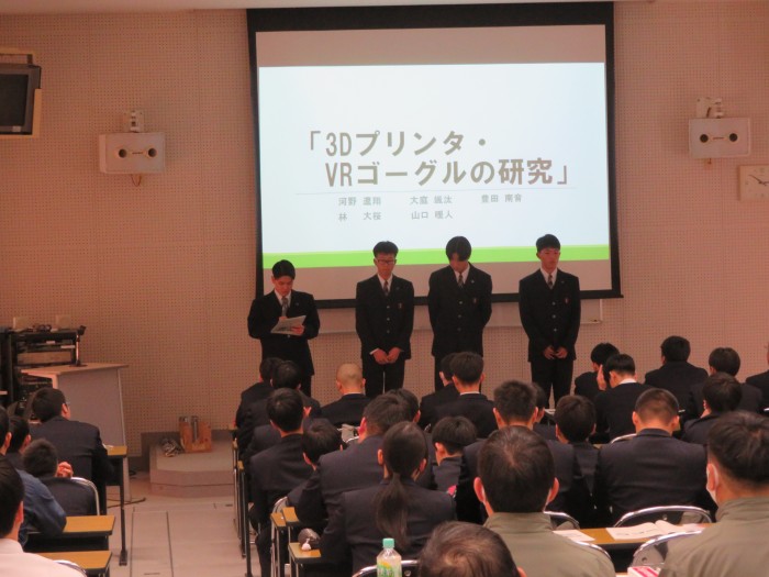 1月20日に土木技術科の課題研究発表会を実施しました。「課題研究」とは、3年生に設置されている科目で、生徒自らテーマを決め、今まで学習してきた知識や技能を活用し、1年間かけて色々な研究や製作を行うものです。