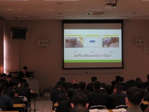1年間の成果の概要をまとめたレポートを作成し、冊子にまとめ、パワーポイントを活用して発表(プレゼンテーション)を行いました。今年度のテーマは、「実習に役立つものづくり」、「道守活動」、「木工製作」、「ドローンの資格取得と校内整備」、「ものづくりコンテストに向けて・民間講師事業」、「3Dプリンタ・VRゴーグルの研究」でした。今回は、保護者の方や企業の方にも見に来ていただきました。