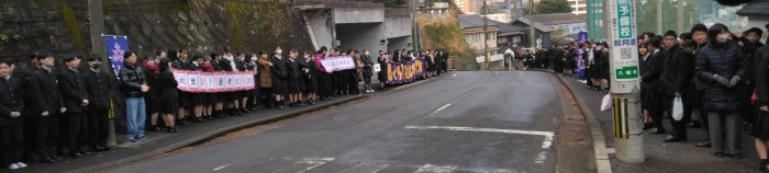 学校から出発する高校3年生の先輩たちを、高校1・2年生が激励と共に見送りました。