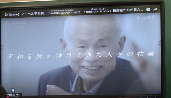 今回は「日本原水爆被害者団体協議会(日本被団協)」が2024年にノーベル平和賞を受賞した番組を紹介しながら、平和について考える時間を設けました。11時2分の黙とうの後は、生徒たちは平和祈念式典のライブ中継にて平和宣言や平和の誓いを視聴し、長崎県民として被ばく者の思いを自分たちの世代が引き継ぐ大切さを感じたようでした。