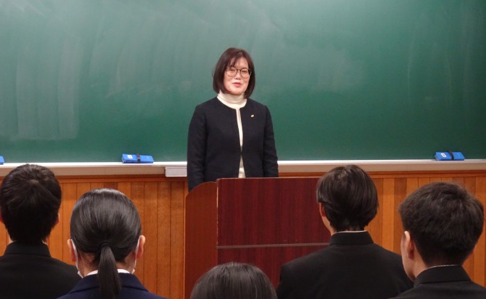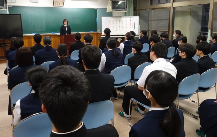始業式では、校長先生からこの3学期に意識して取り組んでほしい2つについての話がありました。ひとつは「自分を見つめる」ことです。これは他者との比較ではなく、自分自身の強みを再認識し、将来の成長につなげてほしいという内容でした。もうひとつは「思考を変える視点を持つ」です。人は情報を得る際、自分の知りたいことだけを見ようとするということで、ネットによる情報収集を例に挙げ、客観的判断が乏しくなるということでした。そこで、視点を変えて様々な情報に触れることが必要であり、「本」「旅」「人」が視点を変える媒体として有益で、人間性を高めることにつながるという内容でした。