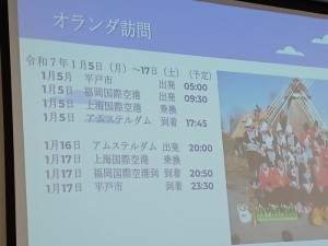 今年も平戸市の国際交流事業、「オランダノールトワイク市姉妹都市交流」に本校から5名の生徒が参加することになりました。まず、オランダの高校生10名が10月27日(月)から平戸に来られ平戸の歴史・文化を学んだり、各家族と過ごしながら日常生活を体験したりして10日間の日本滞在を楽しまれる予定です。受け入れに際して保護者様向けの懇談会や相談会が行われたり、生徒たちは英会話の練習やプレゼンテーションの準備などを未来創造館に集まって進めています。日本の高校生がオランダを訪問する時期は令和8年1月となるようです。今後の交流の様子を報告していきます。