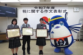 11月26日(水)平戸市役所にて令和7年度税に関する作文表彰式が行われました。平戸市内の高校からの応募作品295点の中から、本校の生徒3名が入賞しました。それぞれ平戸市租税教育推進協議会会長賞、長崎県県北振興局長賞、平戸税務署長賞と、立派な賞をいただきました。