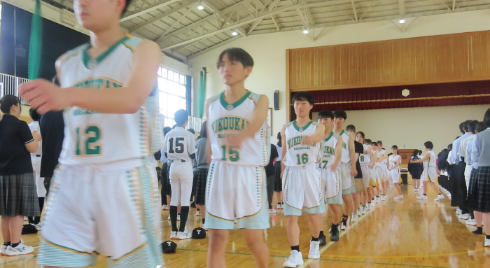 団体紹介:バスケットボール男、バスケットボール女、サッカー、バトミントン、ソフトテニス、空手道、バレーボール、剣道、柔道、卓球、弓道、ダンス部(壮行式入場順)