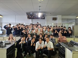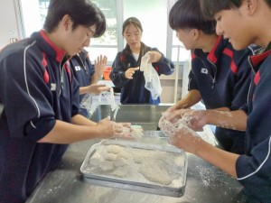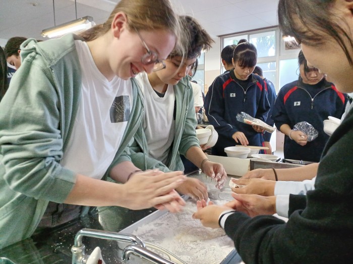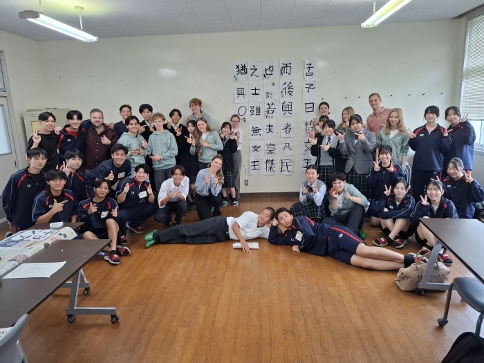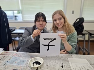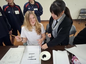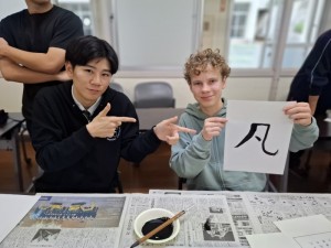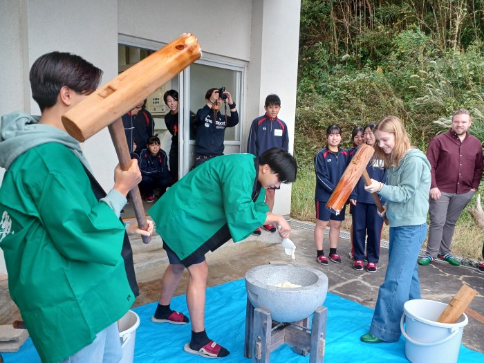 10月31日(金)オランダノールトワイク市から高校生10名と教員3名が来られ、交流活動を行いました。朝の時間で「習字」と「餅つき」の日本文化体験を3年1組の生徒の力を借りて行いました。餅つき活動に関しては材料、準備物、作成手順、味つけ、英語での説明など盛り上げるため試行錯誤を繰り返し、前日にはリハーサルをして臨みました。当日はとてもスムーズに活動でき準備した以上の交流ができました。11月7日(金)には活動すべてが終わりオランダに帰国されました。来年1月には日本からオランダに向けて出発し生徒たちはオランダの街を楽しむことになります。