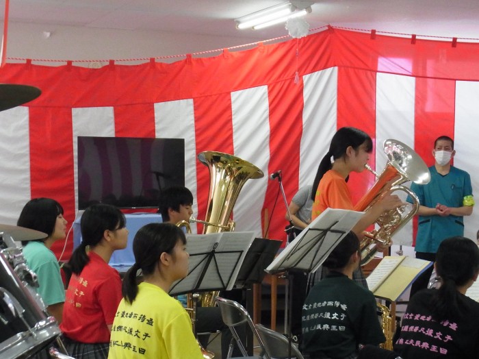 また午後からは施設の外で、青洲会病院の健康祭イベントに参加し、3曲披露する機会をいただきました。1曲目「ノーダウト」、2曲目「どこまでも~how far I'll go~」、3曲目「幾億光年」で盛りあがりました。平戸の海から社会へ向けて羽ばたく若者の力強さを表現してきました。このような機会を与えていただきありがとうございました。また少し猶興館高校吹奏楽部の音が平戸市に響き渡ったようなきがします。