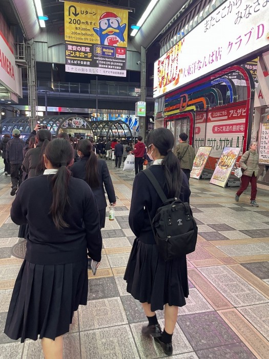 現地から届いた写真には、劇場の前や大阪の賑やかな街並みを背景に、弾けるような笑顔を見せる生徒たちの姿が写っています。