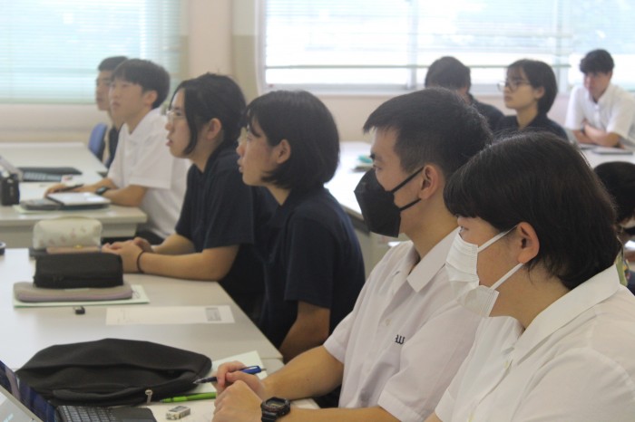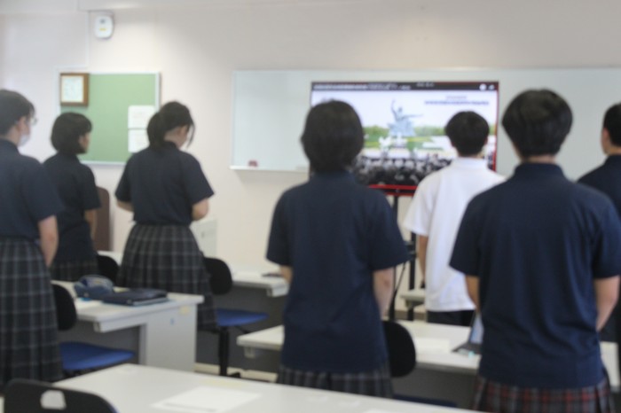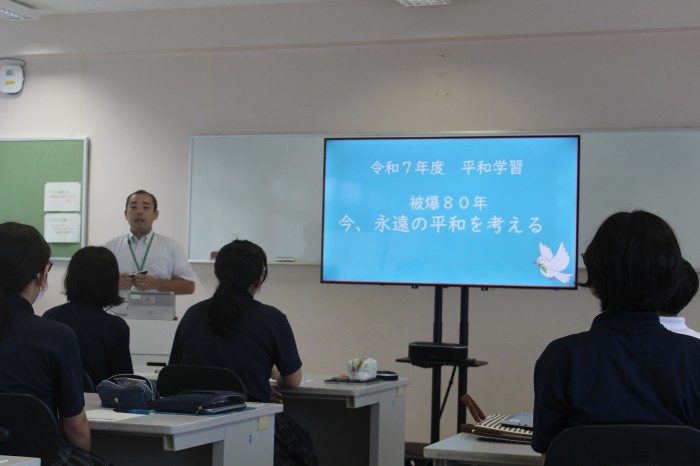 8月9日(土) 平和学習を行いました。今年度は、「被爆80年、永遠の平和について考える」をテーマに、地歴科教員による講義と平和祈念式典の中継視聴を行いました。被爆者の方々の高齢化が進む中で、いかに学び、伝えるかを考えました。11時02分には全校生徒で黙とうを捧げ、平和の尊さについて考え、向き合う時間を過ごしました。