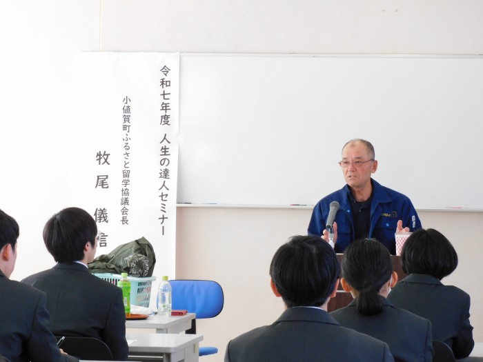 12月11日(木)、人生の達人セミナーを開催しました。今年度は小値賀町ふるさと留学協議会会長の牧尾 儀信様にご講演いただきました。 企業に勤務されていた際のご経験や小値賀町ふるさと協議会でのお取組みの中での気づきや教訓を学び、生徒たちは自分たちの目標への向き合い方や想いを新たにしていました。 牧尾様、本日は誠にありがとうございました。