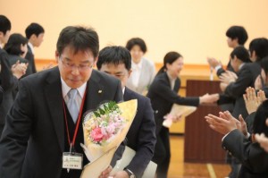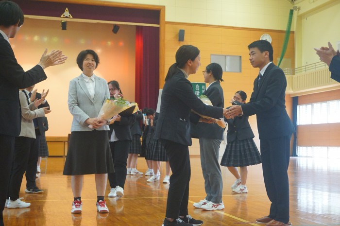 また、離退任式では、6名の先生方からご挨拶があり、生徒による花束贈呈と校歌斉唱、花道を作ってのお見送りを行いました。