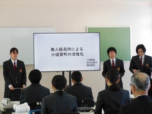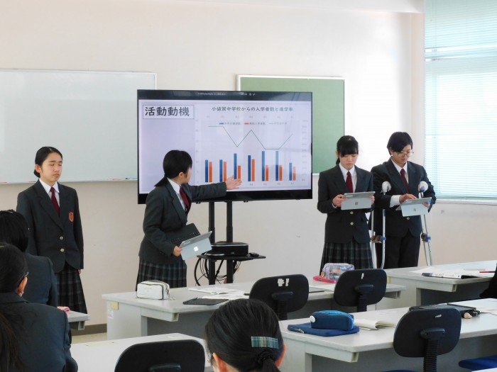 2年生では、来年度行われる議会発表に向けてのプレ発表を行いました。「高校存続インスタ班」と「無人販売所による小値賀町の活性化」の2つの班に分かれ、これまでの活動報告と議会への提案内容について発表をしました。