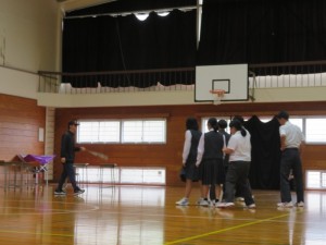「不審者が教室に入って来た時の対処方」を生徒に実演してもらい、警察署の方にアドバイスをいただきました。