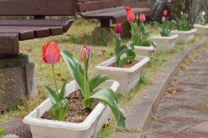 「花いっぱい運動」で11月21日に植えたチューリップが咲き始めました!