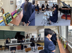 美術選択者は、「私の見つけた風景」というテーマで制作した油彩の風景画作品を音楽室に展示しました。部活後の帰り道で見た夕日、壱岐の島の美しい自然、部屋のなかから覗く庭の景色など、思い思いの瞬間を生き生きと描きました。どの作品も隅々まで創意工夫が詰まっていて、見る者を惹きつける力を持っていました。音楽選択者や教員に対して、自身の作品の制作課程やこだわったポイントについて熱心に説明する様子も、とても頼もしかったです。