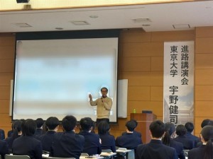 2月10日(火)、東京大学より宇野健司先生をお招きして進路講演会を実施しました。講演では、実際に大学生のゼミでも実践されているディスカッションの進め方について学びました。ディスカッションで意識すべきポイントを教えていただき、発表の際には全員挙手というルールのもと、3人1組で活動を進めました。また、意見を伝える際には「結論→理由→具体例→結論」の順で話すPREP法が有効であることも紹介され、社会的スキルについても学びを深める機会となりました。講演の最後にはマンダラチャートを作成して、全員が発表しました。
