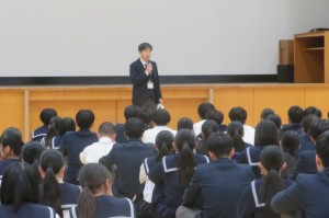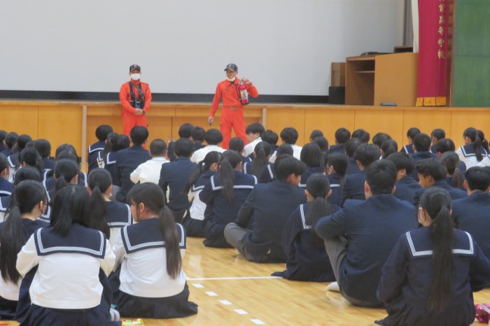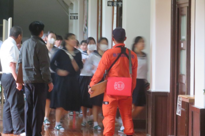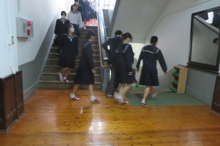 体育館に避難しました。教頭先生から日頃から危機意識を持つことの大切さについて話がありました。