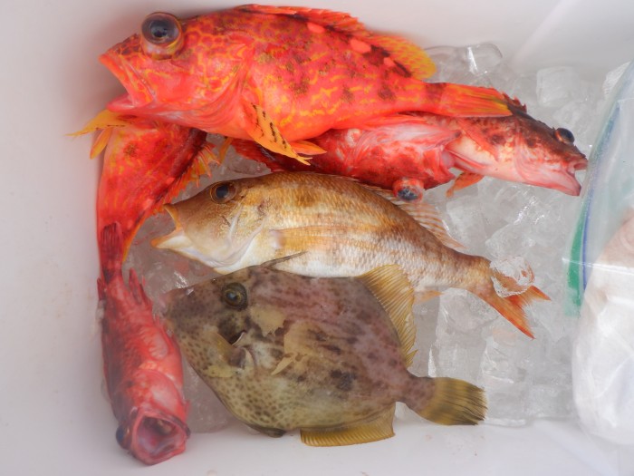 釣果は、深場ではアヤメカサゴ2匹(28cm)、浅場ではカサゴ3匹、