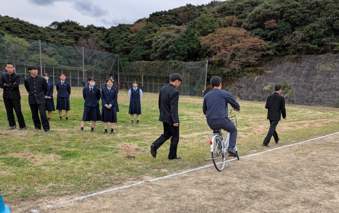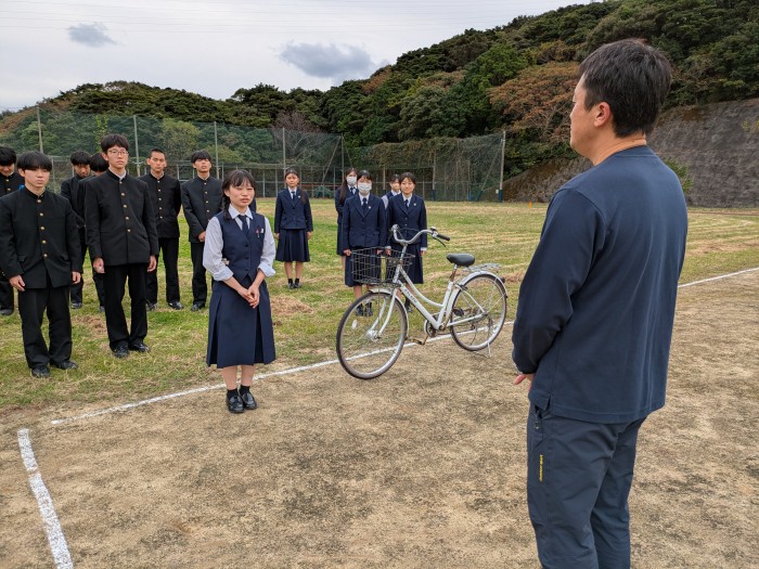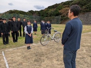 11月13日(木)に五島警察署交通課長の佐々様をお招きして、全校生徒を対象に「交通講話」を実施しました。今年度は、自転車とイヤホンをテーマに話をしていただきました。自転車に乗る前の合言葉「ぶたはしゃべる」を教えて頂きました。これは、自転車の点検箇所の頭文字です。また、後半には高校生に多い、イヤホン使用の危険性について実践を交えて教えていただきました。イヤホンで両耳がふさがった状態で、背後から自転車が来た時の危険性を確認することができました。今後、事故に合わないために、自分の身は自分で守ることを再認識できました。